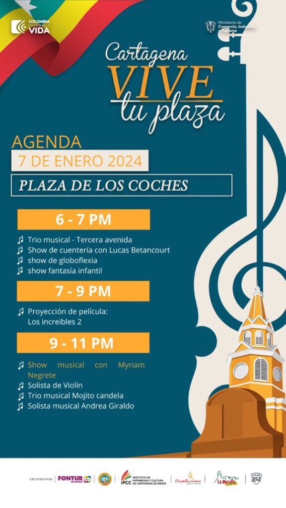 La Alcaldía de Cartagena, a través de Corpoturismo y el Instituto de Patrimonio y Cultura (IPCC), invita a las familias cartageneras y visitantes a disfrutar del Centro Histórico en este comienzo del año con la agenda cultural y turística ‘Vive tu Plaza’, la cual se realiza en estas primeras noches de enero en la emblemática Plaza de los Coches.